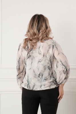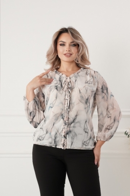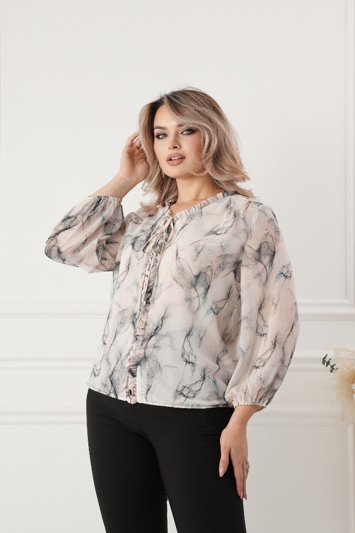 Крой блузки продуман до мелочей: он акцентирует внимание на достоинствах фигуры, мягко скрывая недостатки в области талии и бедер. Это делает модель универсальной и подходящей для различных типов фигур.