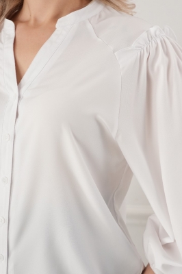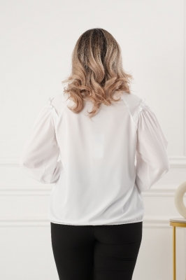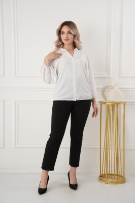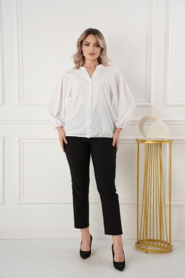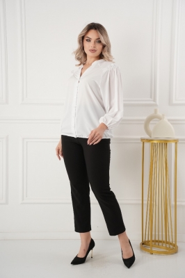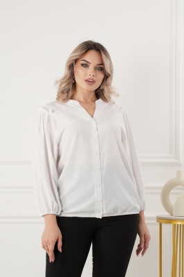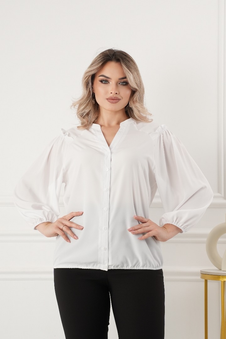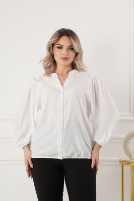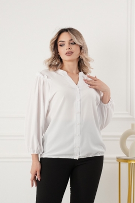 Манжеты рукавов на резинке, на плече оборки, что придаёт блузке дополнительный интересный акцент.Спереди блузка украшена супатной застежкой на петли и пуговицы, которые создают элегантный, офисный стиль.