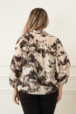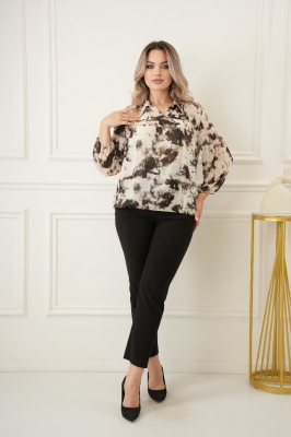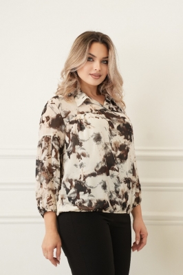 Крой блузки продуман до мелочей: он акцентирует внимание на достоинствах фигуры, мягко скрывая недостатки в области талии и бедер. Это делает модель универсальной и подходящей для различных типов фигур.