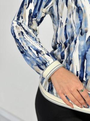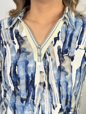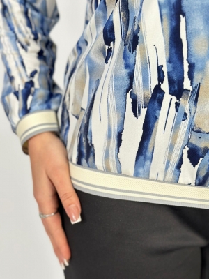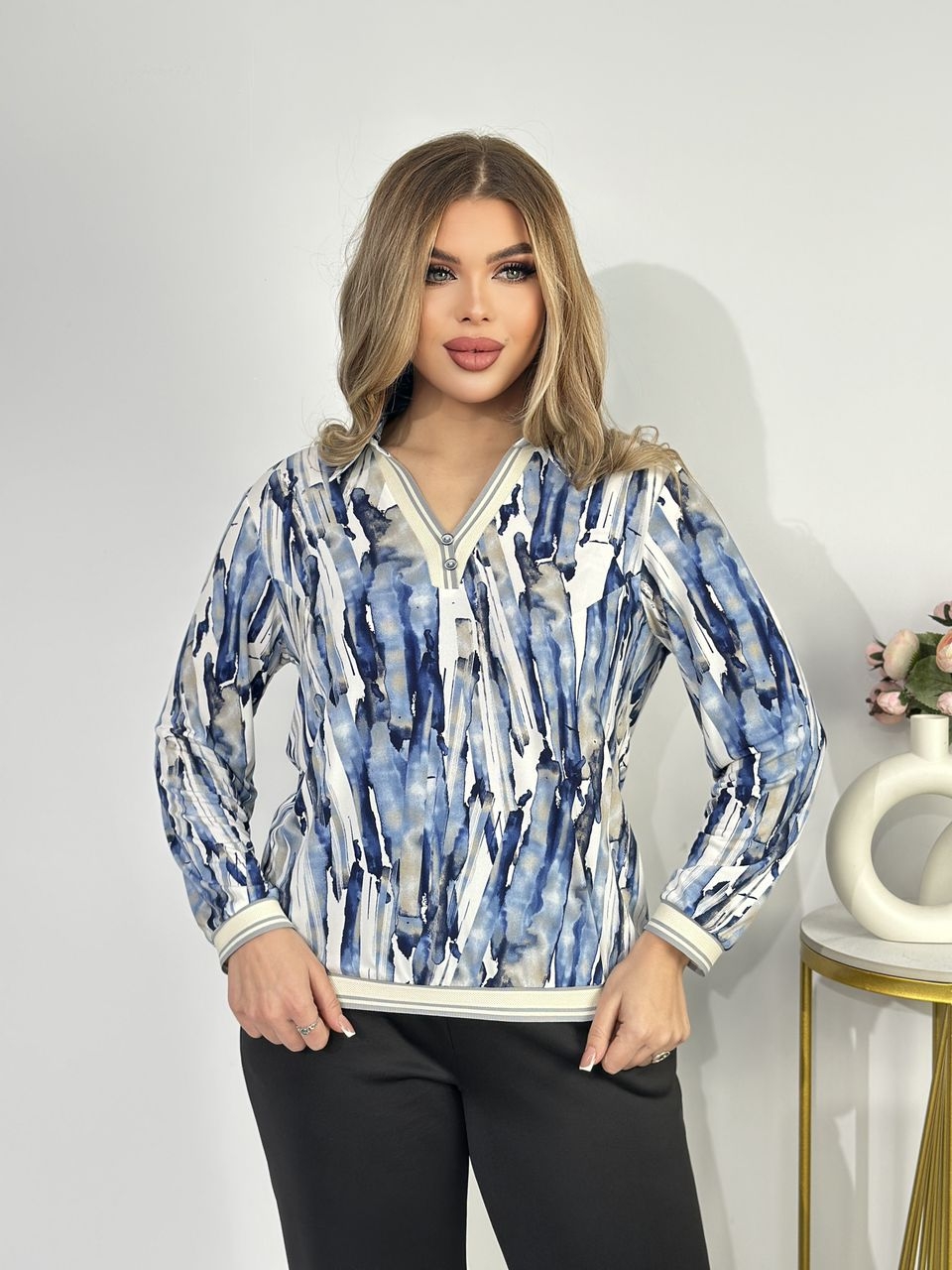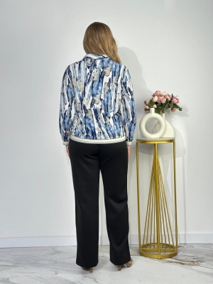 - Блузка-бомбер рубашечного покроя с V-образным вырезом, в размерах 46-56, застежка - на петли и пуговицы.
