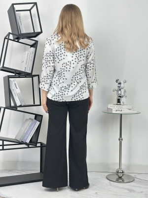 Блузка имеет классический, стандартный крой и рукава ¾, что добавляет ей современного шика, она универсальна и подходит для большинства типов фигур. V-образный вырез горловины подчеркивает линию шеи и декольте, усиливая изысканный образ.
