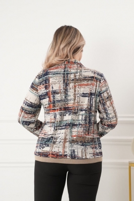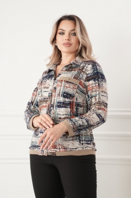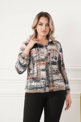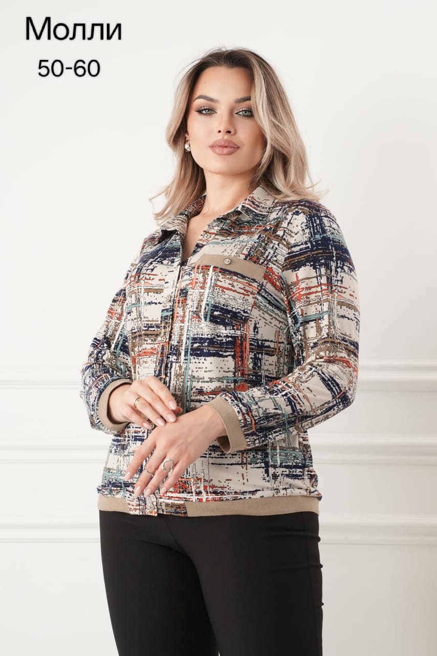 - Трикотажная блузка-бомбер рубашечного покроя в размерах 50-60, застежка - на петли и пуговицы.