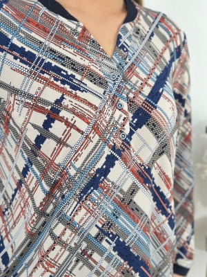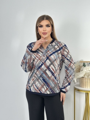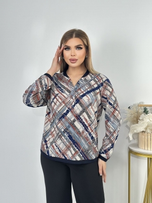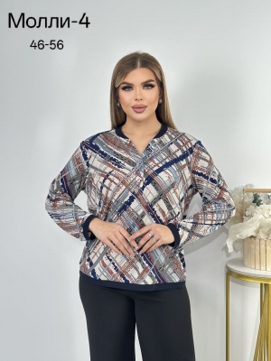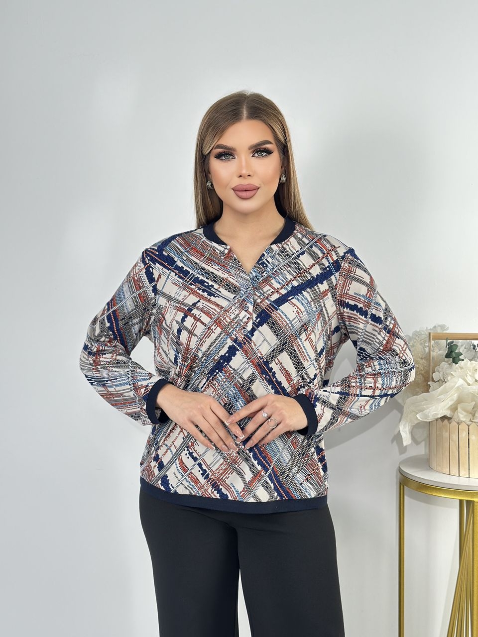 - Трикотажная блузка-бомбер рубашечного кроя с V-образным вырезом, в размерах 46-56, застежка - на петли и пуговицы.