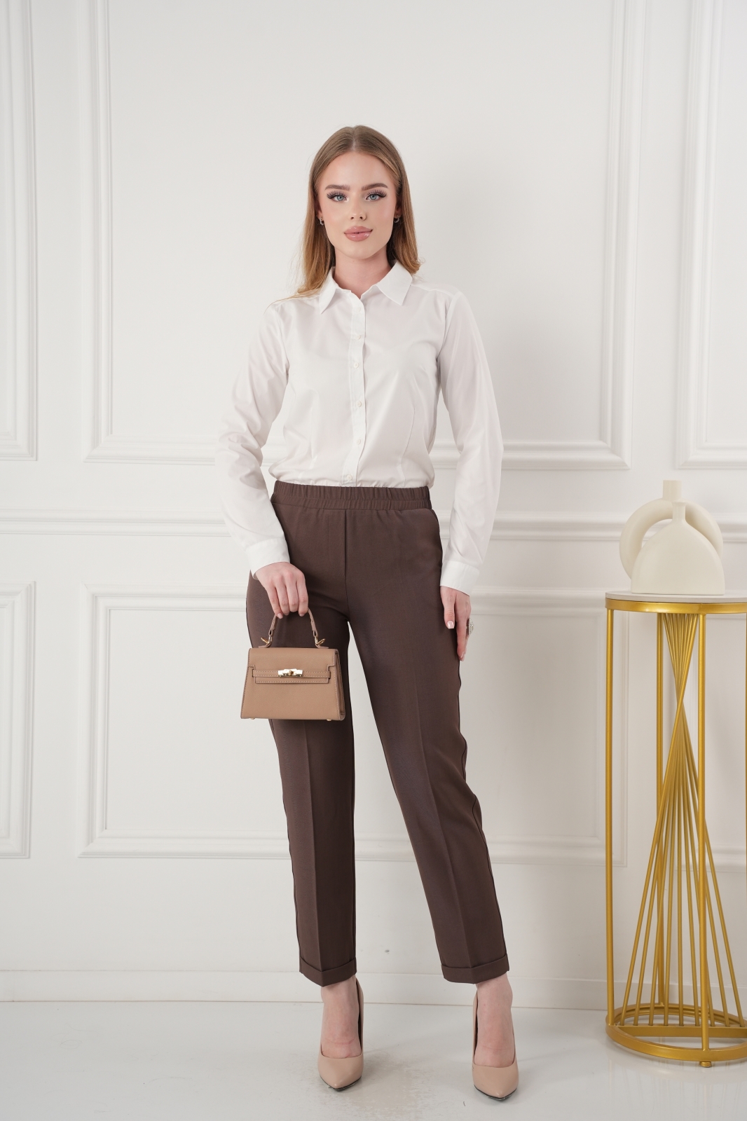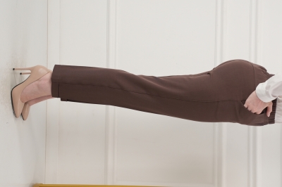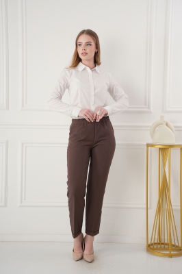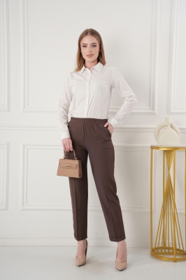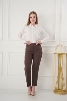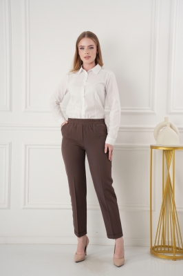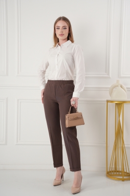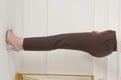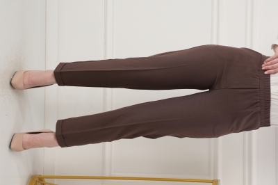 - Укороченные брюки с высокой посадкой на резинке. Низ без пуговок, спереди внизу манжет, сзади нет.