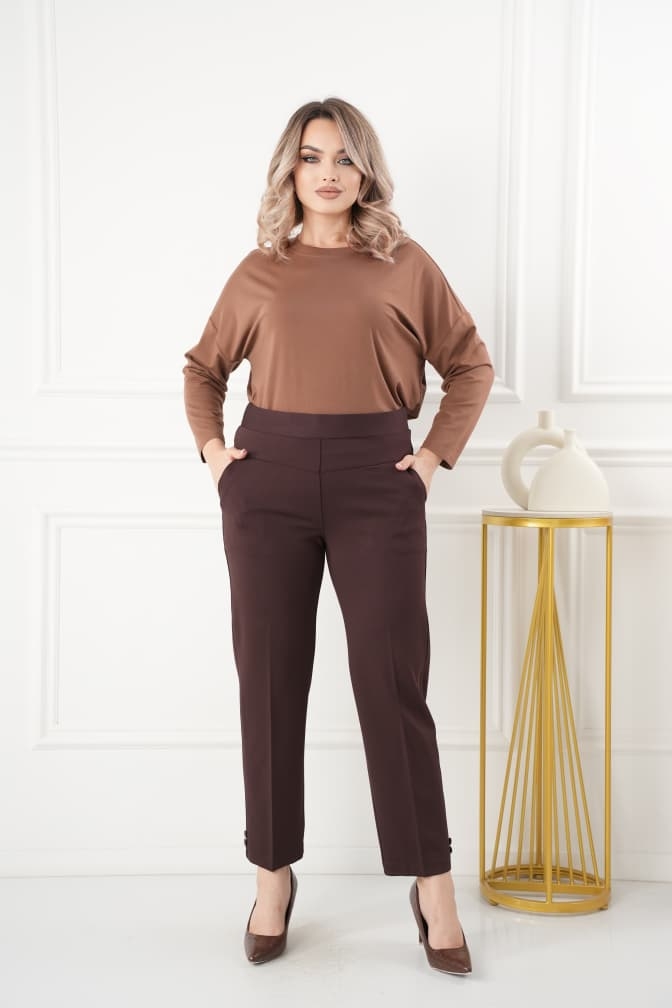 - Длина 7/8 с отделкой двумя пуговицами по низу.